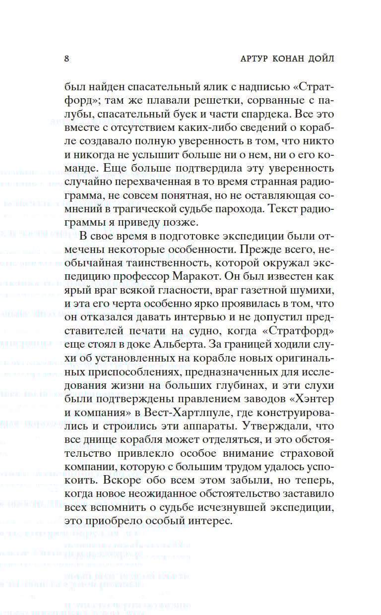 Arthur Conan Doyle (1859-1930) is a major English writer, subtle thinker, public figure, publicist, doctor of medicine and doctor of law. He is known throughout the world as an unrivaled master of detective and adventure genres. The various heroes created by his pen have gained truly enormous fame all over the planet: this includes detective Sherlock Holmes with his faithful companion Doctor Watson, the tireless hero of the Napoleonic Wars Brigadier Gerard, the English knight Sir Nigel Loring, and many, many others. This edition includes one of Conan Doyle's most famous novels, The Maracot Deep (a gripping story about an expedition led by Professor Maracot, who decided to explore the bottom of the deepest ocean trench and discovered an amazing world there), as well as selected sea stories.