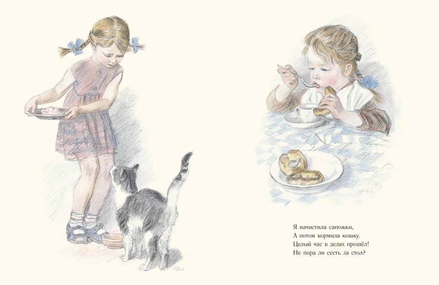 Masha has a lot of activities! The girl does not sit idle: she washes herself, cleans her boots, feeds her cat and sews a dress for her doll. And even freed from worries, the little fidgeter does not waste time: collects mushrooms, catches butterflies and learns to ride a bicycle. Galina Novitskaya's cheerful and kind lines are accompanied by light and dynamic illustrations by Alexey Pakhomov, one of the most talented Russian artists of children's books, who brilliantly managed to realize on paper lively, sincere and direct images of children.