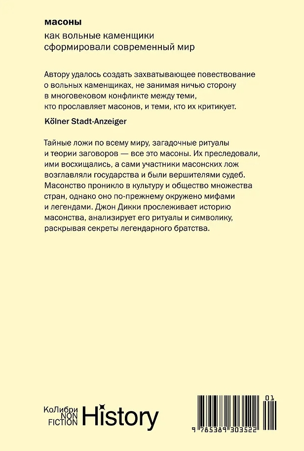 "Some of the myths about Freemasons are quite harmless: they resemble those horror stories that teenagers tell each other with pleasant trepidation, which no one actually believes. But some are quite dangerous. Fear of a Masonic conspiracy led to the violent deaths of thousands of lodge members in the 20th century. Freemasonry is still banned in the People's Republic of China, and in the Islamic world, Freemasonry has long been viewed with paranoid suspicion. <…> Myths and misconceptions have become woven into the very fabric of Freemasonry's history and are now inseparable from it" (John Dickie).