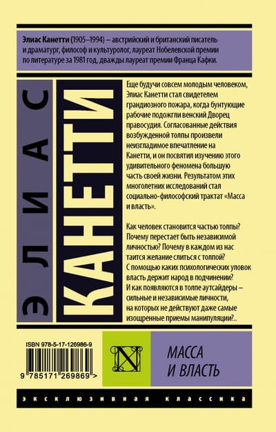 As a very young man, Elias Canetti witnessed a huge fire when rioting workers set fire to Vienna's Palace of Justice. The coordinated actions of the excited crowd made an indelible impression on Canetti, and he devoted much of his life to studying this amazing phenomenon. The result of these many years of research was the socio-philosophical treatise Mass and Power. How does a person become part of the crowd? Why does he cease to be an independent individual? Why in each of us lurks the desire to merge with the crowd? With the help of what psychological tricks the power keeps the people in submission? And how do outsiders appear in the crowd - strong and independent individuals on whom even the most sophisticated techniques of manipulation do not work?....