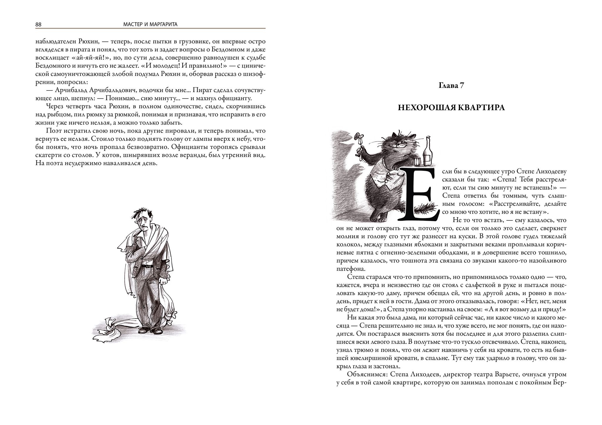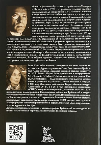 In this edition, Mikhail Afanasyevich Bulgakov's novel "The Master and Margarita" is published in Russia for the first time in its original, complete version, originally published in 1969 in Russian in Frankfurt am Main by Posev Publishing House. Until now, this legendary, complete edition of the novel had never been published in the writer's homeland. The text is illustrated with talented drawings, initials, and homages by St. Petersburg artist Olga Venediktovna Grablevskaya; her works complement both the humor and philosophy of Bulgakov's most famous novel.
