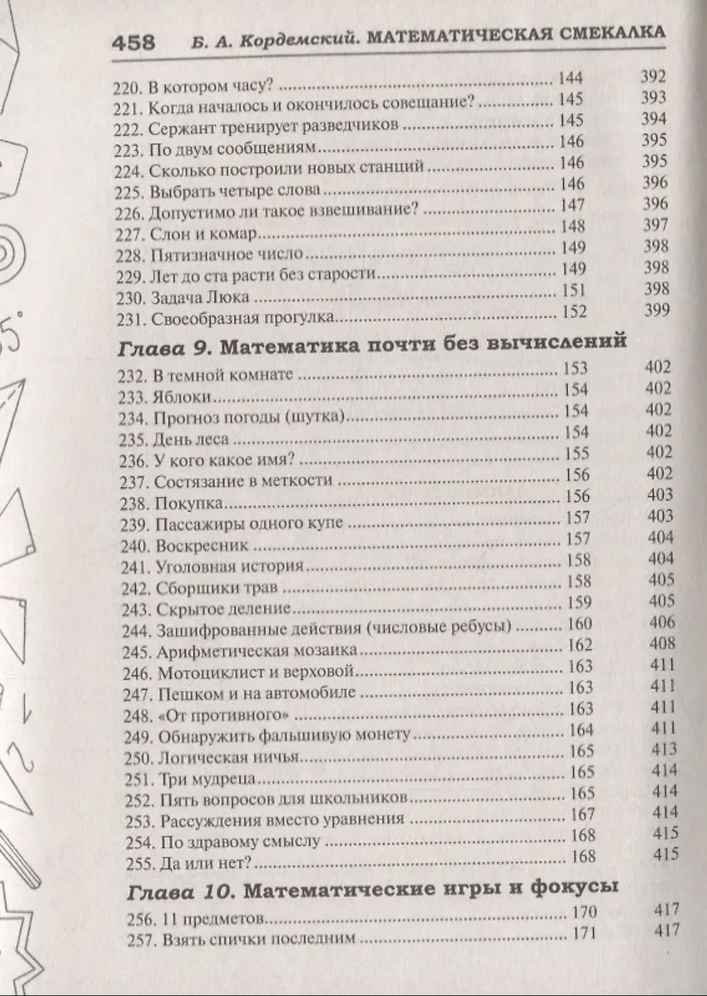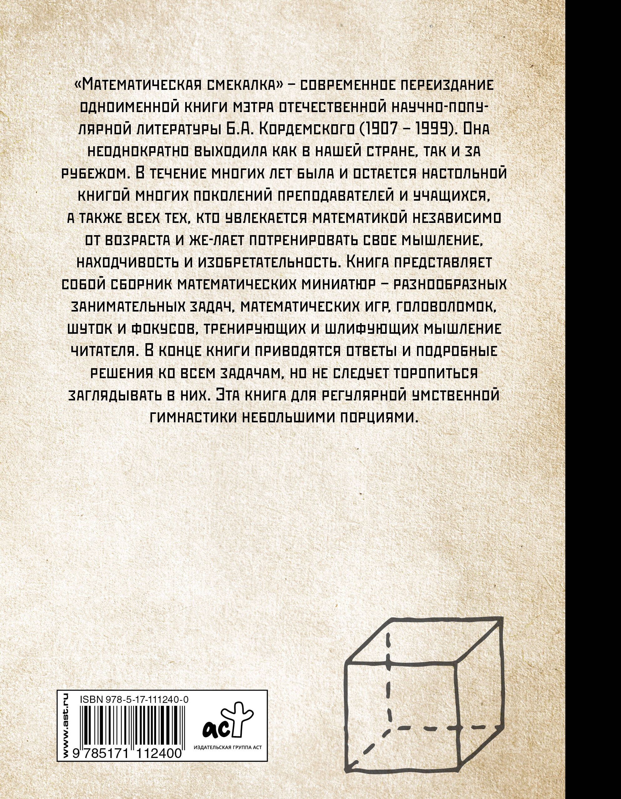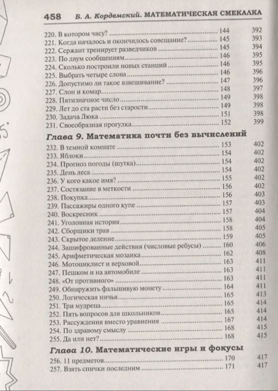 The book by the master of Russian popular science literature Boris Anastasyevich Kordemsky is a collection of mathematical miniatures: various entertaining problems, mathematical games, puzzles, jokes and tricks. It has been published many times both in our country and abroad. For many years, it has been and remains a reference book for many generations of teachers and students. Anyone interested in mathematics, regardless of age, will have the opportunity to practice their thinking, resourcefulness and ingenuity. At the end of the book, there are answers and detailed solutions to all the problems.