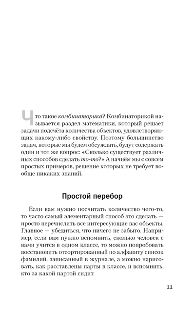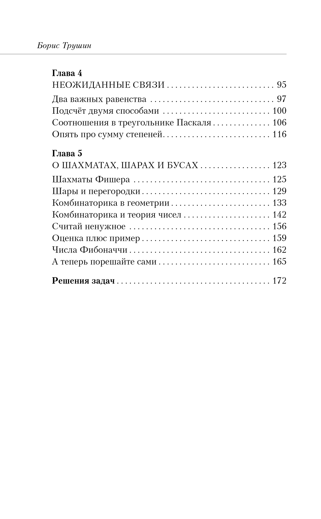 From the author: “Hello everyone! My name is Boris Trushin, and I am a mathematics teacher. I have been teaching mathematics for 24 years and have been running a fairly popular YouTube channel “Boris Trushin” on preschool mathematics for over six years... This book contains my many years of experience teaching combinatorics to schoolchildren of different ages. I tried to show the route that anyone who wants to understand the basics of this science can follow. If you are just starting to get interested in this topic, then read the book from the very beginning, stopping and trying to solve all the problems offered here. Do not be upset if you do not succeed, put the problem aside for a day or two and think some more. At the end of the book there are detailed solutions to each problem. You will learn to understand combinatorics at a fairly high level. Enjoy your reading!”
