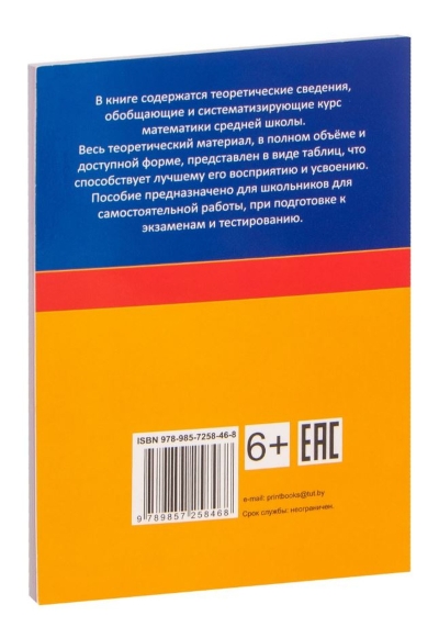 The main objective of the school course is to develop abstract thinking and imagination in schoolchildren, as well as teach them to think logically. The handbook includes all the main topics of the school course Mathematics in an expanded version. It is intended as a manual for consolidating and systematizing knowledge within the framework of school education and external studies. The manual is compiled in the form of tables that systematize the material being studied, summarize theoretical information, and simplify memorization. Effective in preparation for final and entrance examinations. Ideal for home distance learning. The level of the handbook allows it to be used as a visual aid for students and teachers throughout the entire secondary school course. The main goal of the manual is to help applicants and schoolchildren quickly repeat the knowledge acquired during their studies at school.