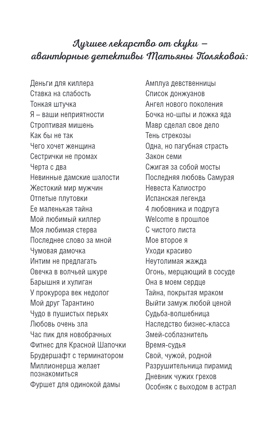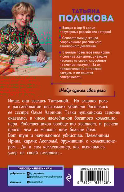 So, she was called Tatiana... But the main role in the investigation of several murders went to her sister Olga Larina. The namesakes of Pushkin's heroines were among the heirs of a rich collector. Relatives are actually enough, and the calculation is simple: the less they are, the greater the share. This is where the murders begin. The niece Irina, the dwarf Leopold, who was a friend of the collector... And the collector himself, as it turned out, did not die of his own accord....