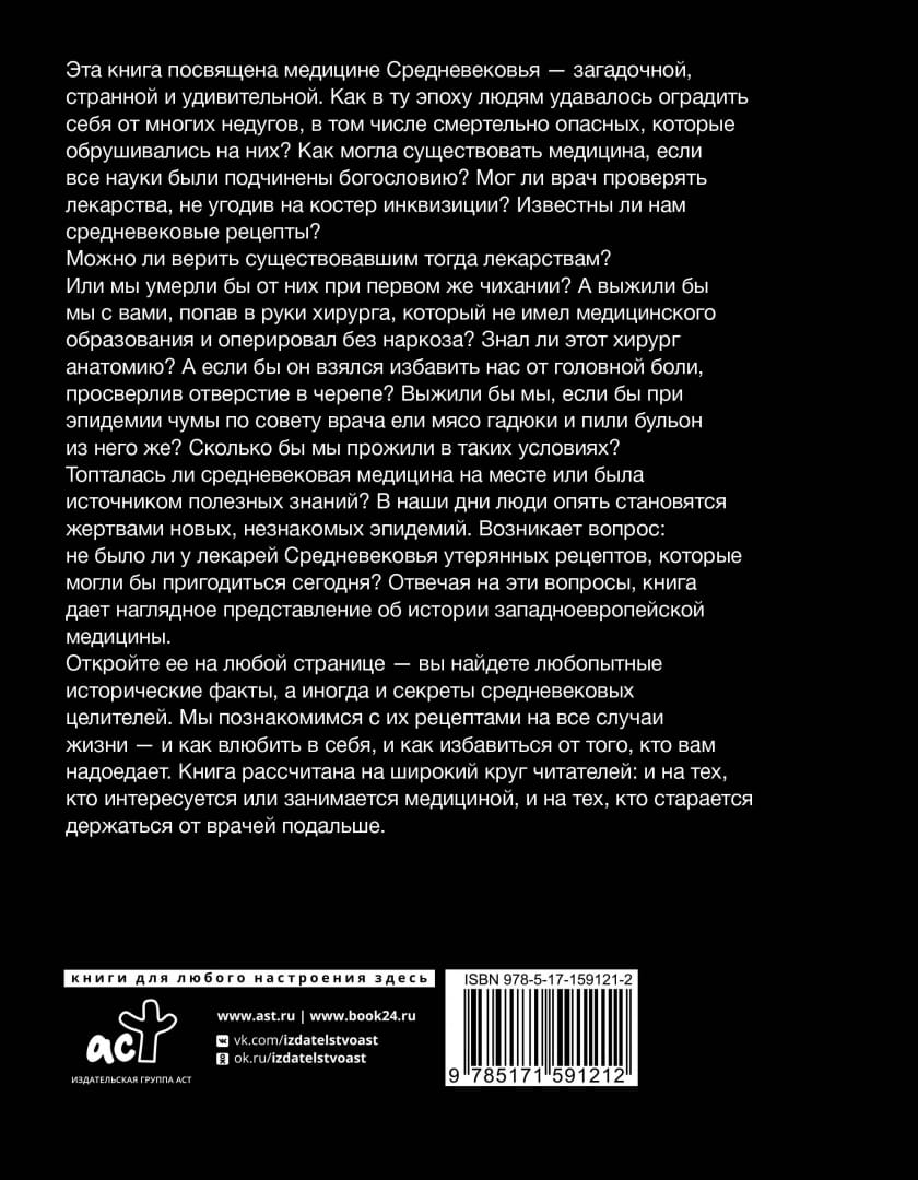 This book is dedicated to the medicine of the Middle Ages - mysterious, strange and surprising. How did people in that era manage to protect themselves from many ailments, including deadly ones, which fell on them? How could medicine exist if all sciences were subordinated to theology? Could a doctor test medicines without going to the stake of the Inquisition? Do we know medieval prescriptions? Can we trust the medicines that existed then? Or would we have died from them at the first sneeze? Would we have survived if we had fallen into the hands of a surgeon who had no medical education and operated without anesthesia? Did this surgeon know anatomy? What if he had taken it upon himself to relieve our headaches by drilling a hole in our skulls? Would we have survived if we had eaten viper meat and drank broth from it during a plague epidemic on the doctor's advice? How long would we have lived in such conditions? Did medieval medicine stand still or was it a source of useful knowledge? Nowadays people are again becoming victims of new, unfamiliar epidemics. The question arises: did the medieval healers have lost recipes that could be useful today? In answering these questions, this book provides a vivid insight into the history of Western European medicine. Open it to any page and you will find curious historical facts and sometimes even secrets of medieval healers. We will get acquainted with their recipes for all occasions - and how to fall in love with yourself, and how to get rid of someone who annoys you. The book is designed for a wide range of readers: those who are interested in or engaged in medicine, and those who try to stay away from doctors.