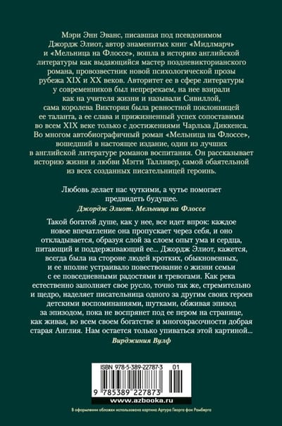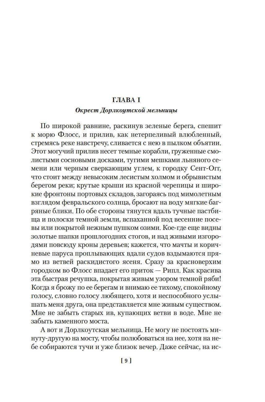 Mary Ann Evans, who wrote under the pseudonym George Eliot, author of the famous books "Middlemarch" and "Mill on Floss", went down in the history of English literature as an outstanding master of the late Victorian novel, the herald of the new psychological prose of the turn of XIX and XX centuries. Her authority in the field of literature in the contemporaries was unquestionable, she was looked upon as a teacher of life and called the Sibyl, Queen Victoria herself was a zealous admirer of her talent, and her fame and lifetime success is comparable in the whole XIX century only with the achievements of Charles Dickens. The largely autobiographical novel The Mill on the Floss, included in the present edition, is one of the finest novels of education in English literature. It tells the story of the life and love of Maggie Tulliver, the most charming of all the heroines created by the writer.