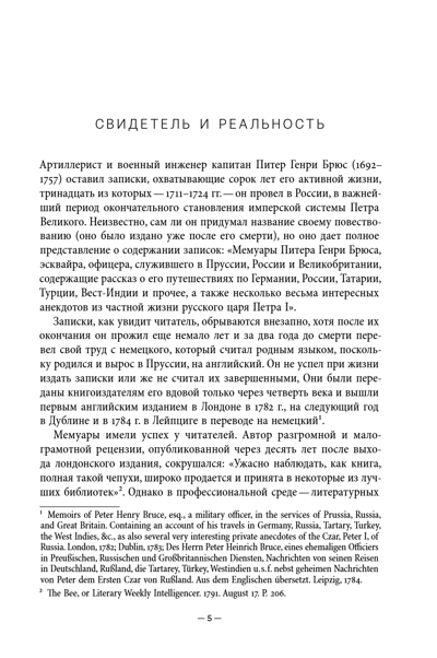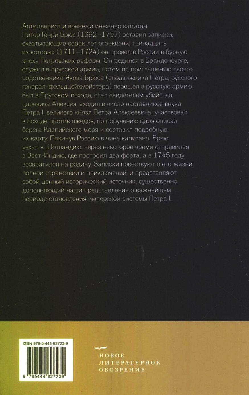 Artilleryman and military engineer Captain Peter Henry Bruce (1692–1757) left behind memoirs spanning forty years of his life, thirteen of which (1711–1724) he spent in Russia during the turbulent era of Peter the Great's reforms. Born in Brandenburg, he served in the Prussian army, then, at the invitation of his relative, Yakov Bruce (Peter's associate and Russian General-Master of the Field), transferred to the Russian army. He participated in the Pruth campaign, witnessed the assassination of Tsarevich Alexei, served as a tutor to Peter the Great's grandson, Grand Duke Peter Alexeevich, participated in the campaign against the Swedes, and, at the Tsar's behest, described the shores of the Caspian Sea and compiled a detailed map. Leaving Russia with the rank of captain, Bruce went to Scotland, and after some time traveled to the West Indies, where he built two forts. He returned home in 1745. The notes recount his life, full of wanderings and adventures, and represent a valuable historical source that significantly enhances our understanding of the most important period in the formation of Peter I's imperial system.