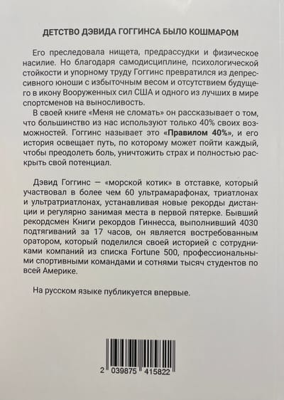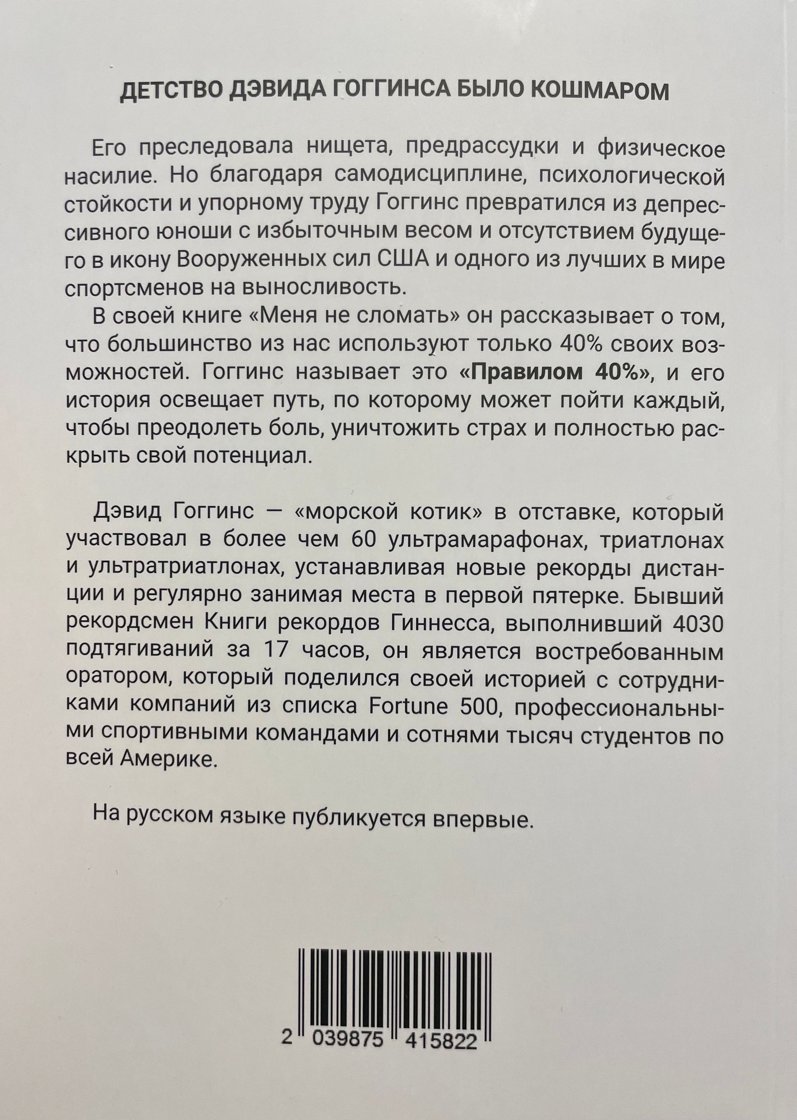 In the book, he explains that most of us only use 40% of our potential. Goggins calls this the "40% Rule," and his story illuminates a path anyone can take to overcome pain, eradicate fear, and reach their full potential.