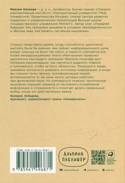 The author of the book Maxim Kiselev, a business coach, author of the course "Critical Thinking", is sure that by correcting your own mental attitudes, you can learn to control incoming data, as well as navigate well in them. The book provides exercises and thinking practices that will help you avoid thinking traps and turn crisis situations to your advantage by relying on analysis and awareness. These skills will be useful both for making important business decisions and for recognizing false information in everyday life.