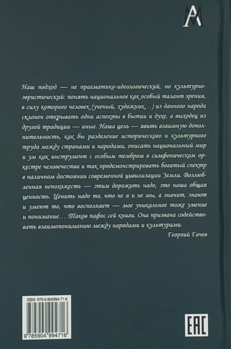 The book by the famous Russian philosopher, culturologist and literary critic Georgy Dmitrievich Gachev (1929-2008) is devoted to the national peculiarities of cultures and civilizations. Each national integrity is considered as Cosmo-Psycho-Logos, i.e. the unity of local nature, character of the people and their way of thinking. The interdisciplinary approach makes it possible to describe the national world and national mind as a certain invariant at different levels: in everyday life, language, religion, literature and arts, natural science, etc. The first part of the book, which is a course of lectures, poses general problems and outlines the technique of researching national mentalities.