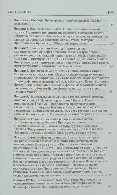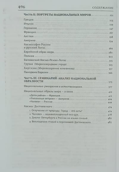 The second part gives "portraits" of national worlds: Greece, Italy, Germany, France, America, Russia, Poland, Bulgaria, Georgia, Kyrgyzstan. The third part is a seminary, a workshop that explores national images of the world in natural science and film art, and presents the experience of reconstructing Dostoevsky's Cosmos.
