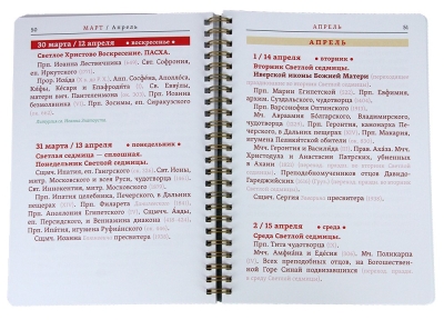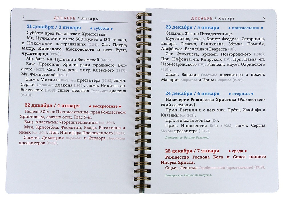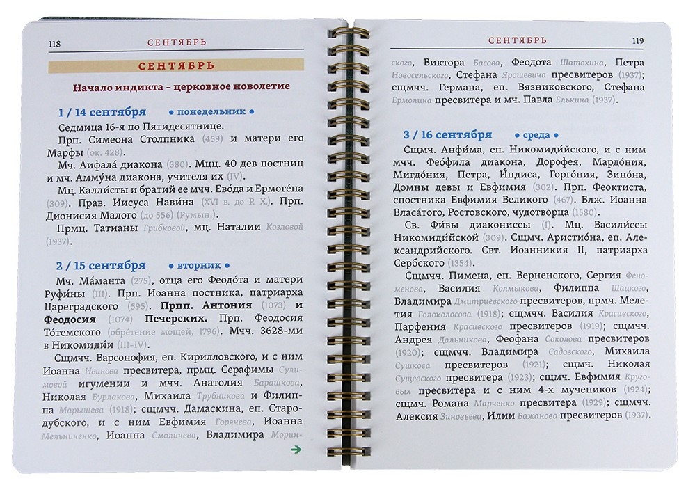 The names of the new martyrs and confessors of the Russian Church, the century or year of the saint's death, and information about movable feasts are given in a muted color so that the eye first "picks out" the names of the saints from the text. Accent marks are placed above complex and unusual names.