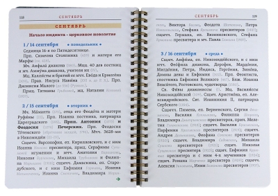 A Menologion of the Russian Orthodox Church, adapted for use at the Proskomedia. The Epistle and Gospel readings, most feasts in honor of icons of the Mother of God, and other information not related to the commemoration of saints are omitted. Only the names of feasts, weeks, weeks, and days are included for easy navigation within the calendar grid.