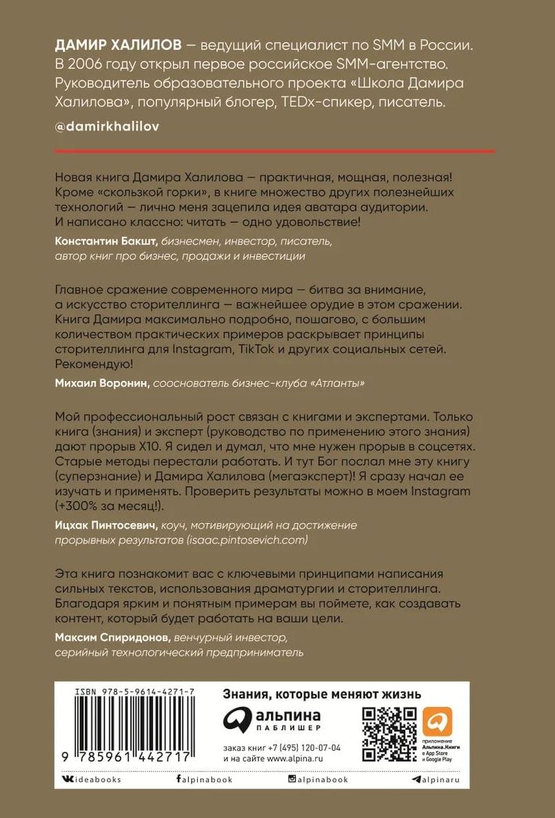 Every minute, more than three billion people share hundreds of millions of videos, posts, tweets, audio, photos and images on social media. With so much content out there, the competition between brands for users' attention gets fiercer, and the success of your marketing campaign depends on how quickly you can adapt to changes and predict trends. To win the battle for attention, you need to learn how to tell stories in an engaging way and lead the reader from the first glance at your content to a targeted action, says Damir Khalilov, one of the leading SMM specialists in Russia. In his book, he talks about the slippery slide method and other universal storytelling techniques, which are used in his practice by "star" scriptwriters, famous writers and experienced advertisers. This book will teach you how to create exciting, trustworthy content for social networks, which will be remembered by the audience and widely spread thanks to word of mouth, will tell you how to get the most out of promotion and increase monetization.