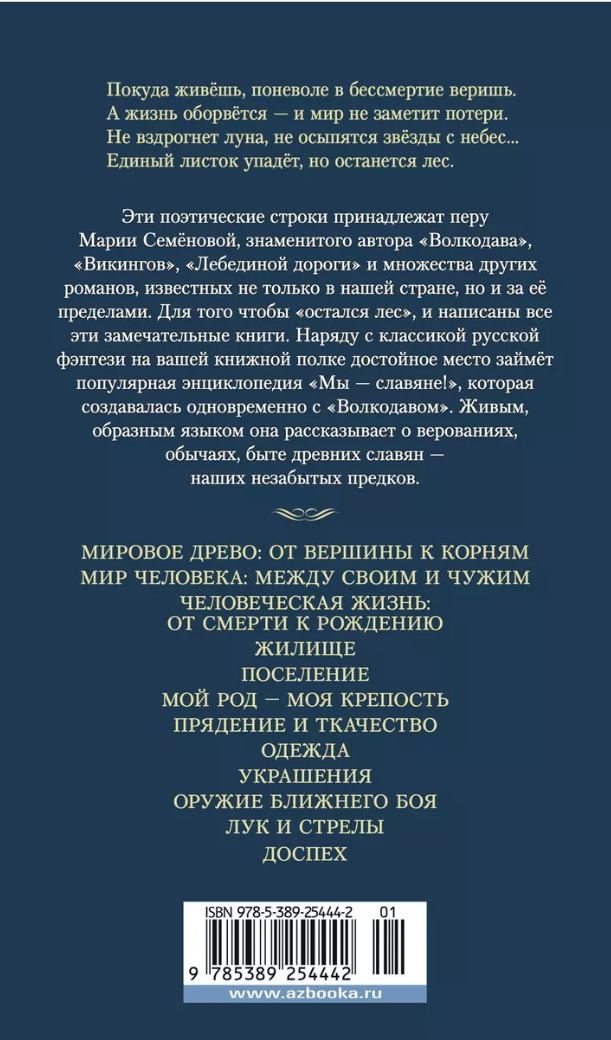 Maria Semyonova is a great master who has said her resounding word in Russian literature. She created her own "quasi-Slavic" world, earning the gratitude and sincere admiration of millions of readers. Her pen belong to "Swan Road", "Duel with the Serpent", "Where the forest does not grow", "Valkyrie", "Sword of the Dead" and many other novels. The most famous of them - "Volkodav" - for many has become a desk book, which is reread and taken with him on the road, like a piece of home. However, "the last of the Gray Dogs" would not have been born without his unnamed alter ego, Vyatich or Krivich, the hero of the popular encyclopedia "We are Slavs!". According to the writer, both of these books were created in parallel. Thus the great mythmaker Maria Semyonova dispelled the myth that our ancestors silently drifted into oblivion. The memory of them covered with the dust of centuries and archives, nevertheless the information would be enough for more than one volume. Strictly speaking, the encyclopedia can not be attributed to the results of scientific research, primarily because of the emotional, lively presentation - but maybe this is what the book will be remembered by the reader? Meanwhile, here is collected serious factual material, devoted mostly to paganism, in which the author sees the keys to understanding the spiritual and material world of the ancient Slavs. Mythology and pantheon, everyday life and customs, household utensils, weapons, crafts - this book can be read from any chapter and in any sequence with ever-increasing interest. The edition contains more than 300 illustrations based on ethnographic sources.