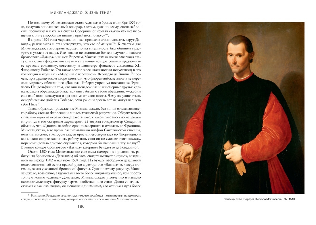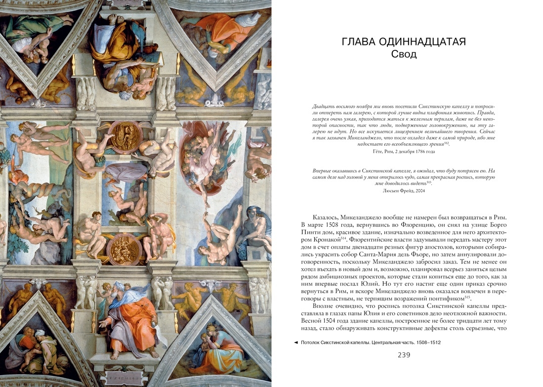 At thirty-one, Michelangelo was considered the finest artist in Italy and perhaps the world; long before his death at the advanced age of nearly ninety, admirers called him the greatest sculptor and painter who ever lived. (And detractors, of whom there was no shortage either - an arrogant cad, a miser, and a fraud.) Decade after decade he worked in the epicenter of turbulent events that determined the face of the European world and the course of history. Michelangelo's accomplishments are grandiose - just remember the huge area of frescoes of the Sistine Chapel or the marble giant David. And yet realized by him at the limit of human strength - only a small fraction of his plans, the scale of which was truly more to match the demiurge than mortal ...