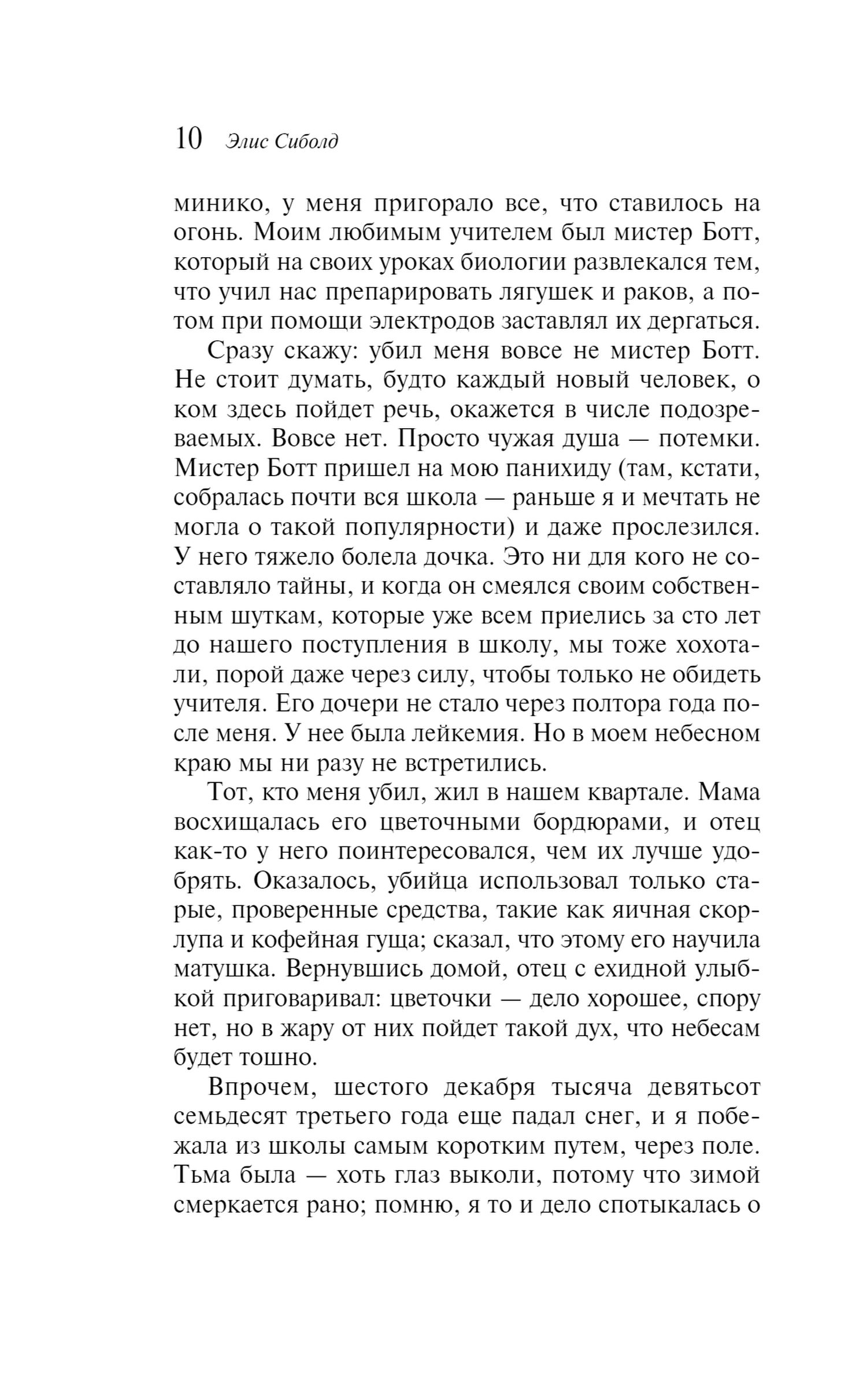 "On December sixth, 1973, I was fourteen years old when I was murdered," so begins the most startling novel of the early twenty-first century. The protagonist, Susie Salmon, finds herself in heaven after her death, watching from above as her killer tries to cover his tracks and her family tries to come to terms with their loss. But this powerful, dramatic book is not about murder, not about violence, but about life. Life after death. The life of those left behind. Perhaps that's why it's surprisingly easy to read and doesn't leave a heavy feeling.