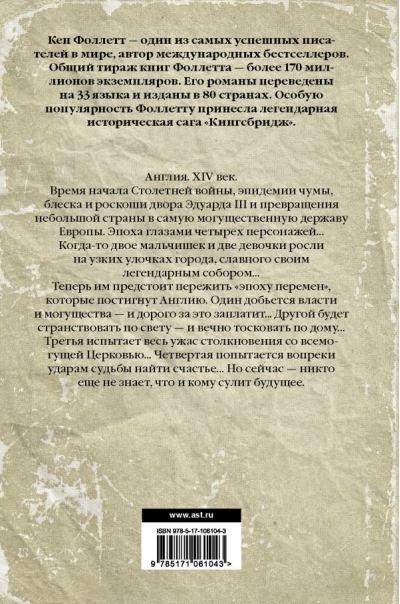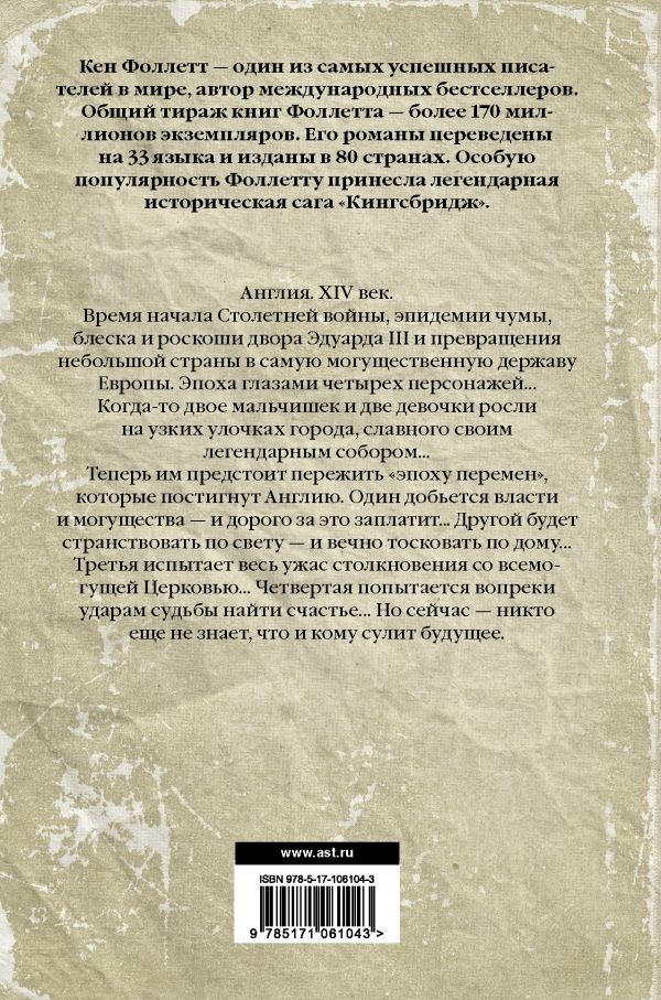 England. XIV century. The time of the outbreak of the Hundred Years' War, the plague epidemic, the splendor and luxury of Edward III's court and the transformation of a small country into the most powerful power in Europe. The era - through the eyes of four characters ... Once two boys and two girls grew up in the narrow streets of the city, famous for its legendary cathedral ... Now they are to experience the "age of change" that will befall England. One will achieve power and might - and pay dearly for it ... Another will wander the world - and forever long for home.... A third will experience the horror of confrontation with the all-powerful Church. A fourth will try to find happiness against the odds... But now - no one knows what the future holds for whom.