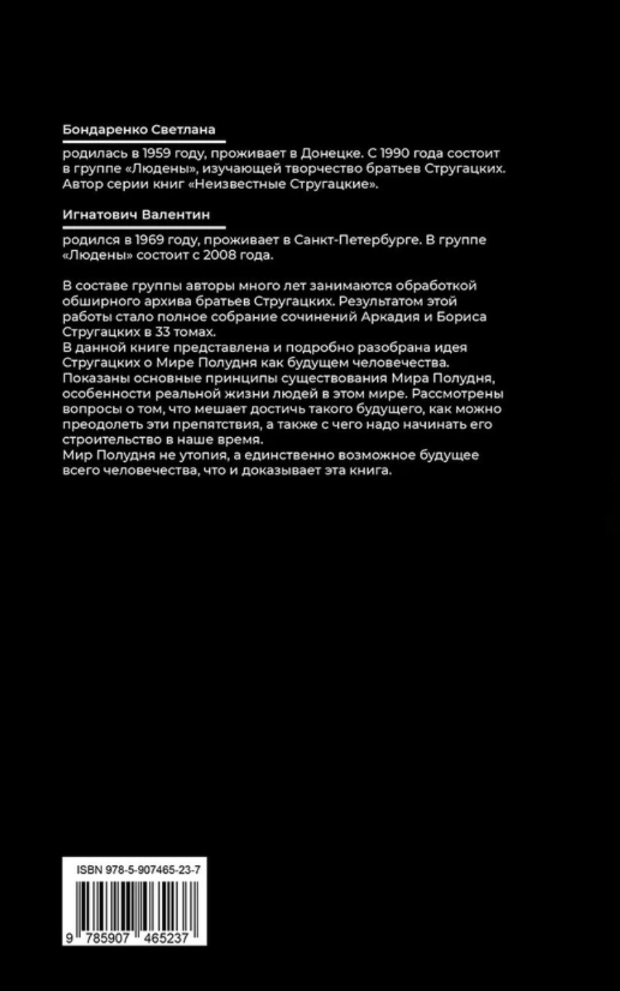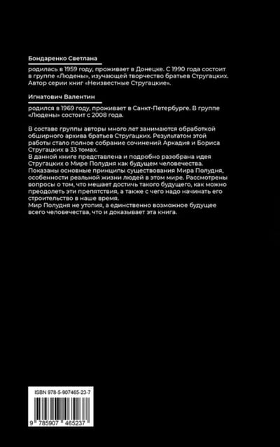 Here is a new work from leading Russian researchers of the Strugatsky brothers' work. It is dedicated to the concept of the future developed by the Strugatskys - the Noon World. Based on numerous quotes from the brothers' works, their drafts, articles and letters, the basic principles of the existence of this world, what prevents it from being achieved and how to overcome it are examined.