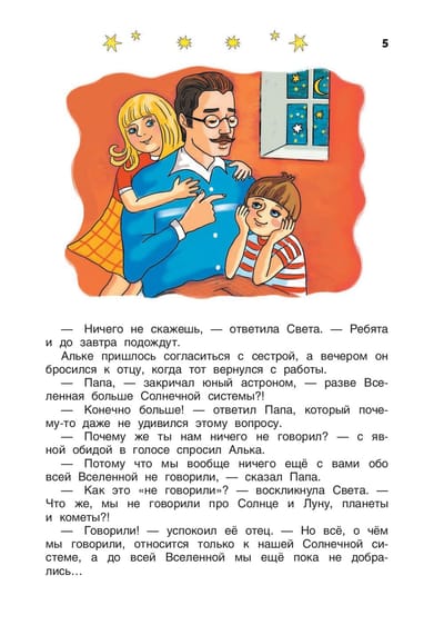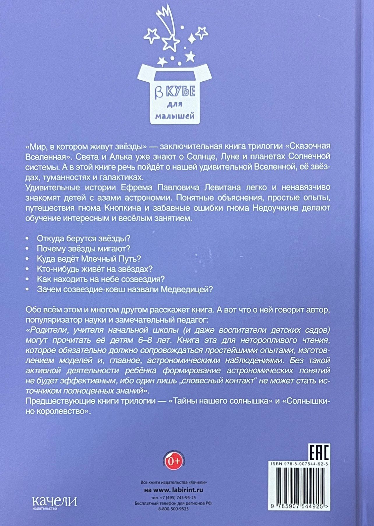 "The World Where the Stars Live" is the final book of the "Fairy Tale Universe" trilogy. Sveta and Alka already know about the sun, the moon and the planets of the solar system. And in this book we will talk about our amazing Universe, its stars, nebulae and galaxies. Amazing stories by Efrem Pavlovich Levitan easily and unobtrusively familiarize children with the basics of astronomy. Clear explanations, simple experiments, travels of the gnome Knopkin and funny mistakes of the gnome Nedouchkin make learning an interesting and fun activity.