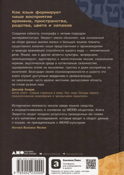 Everett combines scientific accuracy and accessibility of presentation: complex concepts are illustrated by vivid examples from different languages of the world. The main value of the book is that it summarizes the latest discoveries in linguistics, many of which were made in the study of rare languages of small peoples. It presents a fresh look at fundamental questions about the nature of language and human cognition.