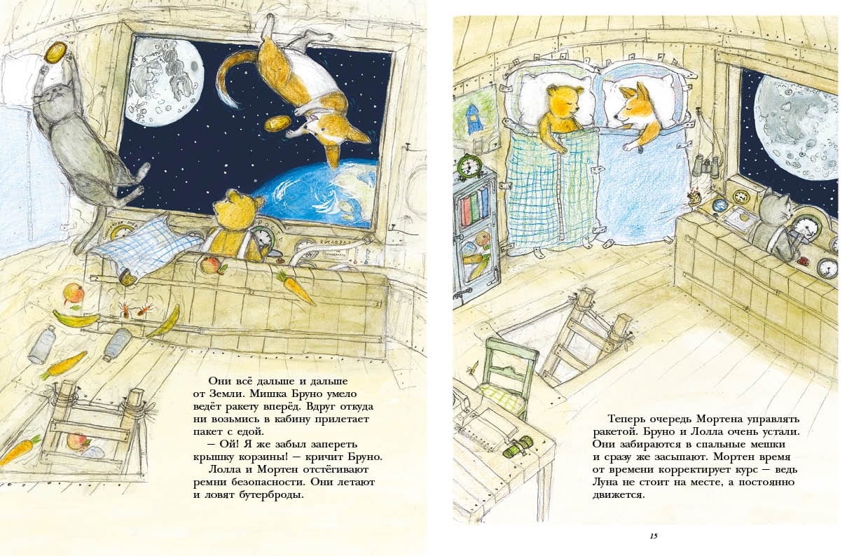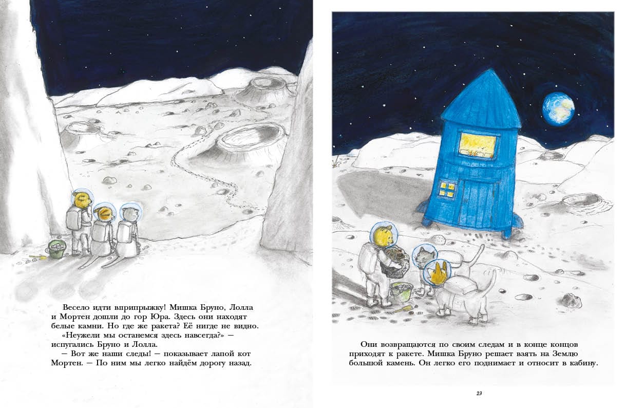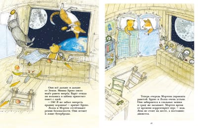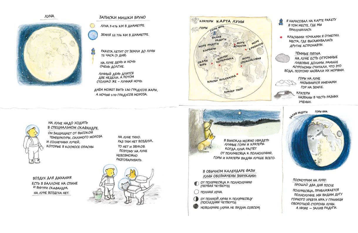 Bruno Bear and his dog Lolla are the famous heroes of a series of educational picture books devoted to observing nature: "Bruno Bear's Autumn", "Bruno Bear's Winter", "Bruno Bear's Spring", "Bruno Bear's Summer". This time Bruno, Lolla and Morten the cat decide to travel to the moon. During the trip, the friends learn many amazing facts about the Earth's satellite and even bring home moon rocks. At the end of the book the reader is waiting for a special informative part - "Notes of Bruno Bear". There is a map of the Moon, information about its size and geography, as well as an accessible explanation of what the Earth's gravity is and why the Moon is visible to us, then only half, or even not visible at all. All books about Bruno Bear can be called mini-encyclopedias for the youngest readers from 3 to 5 years old. They give the first necessary information about the surrounding world and are characterized by delicate illustrations in pastel colors, a lot of details to look at on each page and charming main characters.