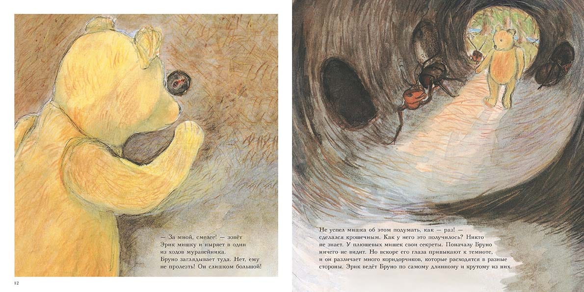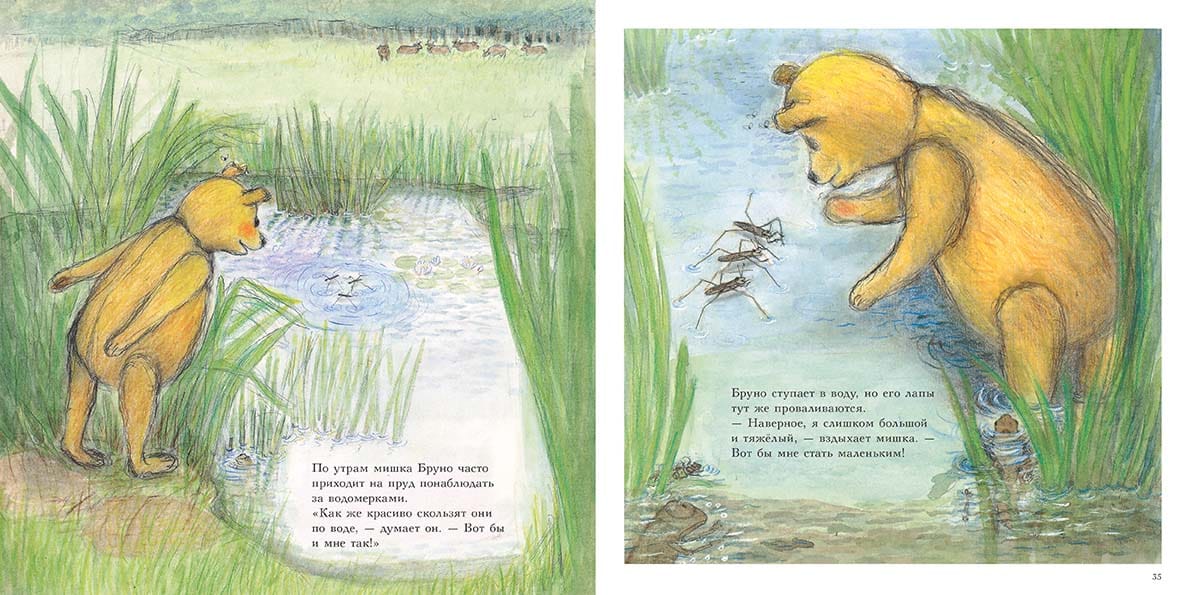 Bruno Bear in the Forest continues the series of informative picture books created by the famous Swedish writer and illustrator Gunilla Ingves. The book includes two stories: "Bruno Bear and the Ants" and "Bruno Bear, Akke the Frog and the Little Pond Dwellers". In the first story, Bruno Bear walks through the forest where he meets Eric the ant, who invites Bruno Bear to visit his home in the anthill. The inquisitive teddy bear can make himself small when he wants to. How? That's his secret! After becoming the size of an ant, the bear dives into one of the anthill's passages and learns how the large ant community lives. Then his friend Lolla the dog comes and together they go to see how the ants herd aphids and extract sweet syrup. The teddy bear then carefully records his observations in his diary. Bear's notes and drawings take up four pages: an anthill in section, ants' "professions", ants' food, their friends and enemies, and other interesting information about ants' life. In the second story, Bruno the bear goes to a pond and meets Akke the tadpole, who teaches the bear how to swim and dive. At the bottom of the pond, the friends help a maggot to fix its house and barely get away from a huge dragonfly larva. Suddenly the bear notices that Akke has lost his tail and has turned into a frog. In the evening, they sit on a lily leaf and see the dragonfly larva emerge from the water and shed its shell. In the morning, the dragonfly spreads its wings and soars into the air. The observant bear writes down everything he has seen and learned during this walk in his diary. Four pages are filled with his notes and drawings: Akke's life cycle from egg to adult frog, enemies of frogs, as well as insects and other creatures he saw on the pond. With gentle illustrations, lots of details to look at on every page, and charming characters, the Bruno Bear books teach children ages 3-6 to love nature.