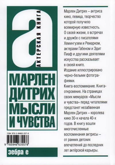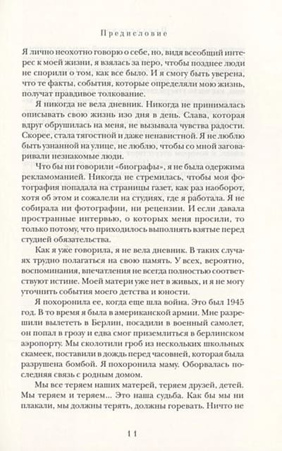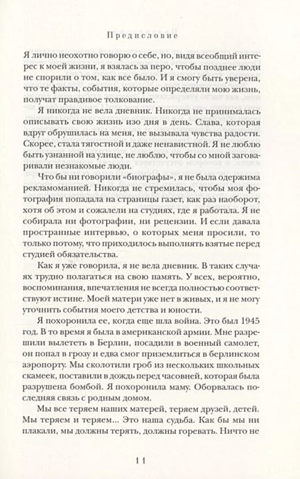 Marlene Dietrich was a film actress and singer whose work became world-famous. In her book she tells about her life, meetings and friendship with writers Hemingway and Remarque, actors Gaben and Edith Piaf and other artists.