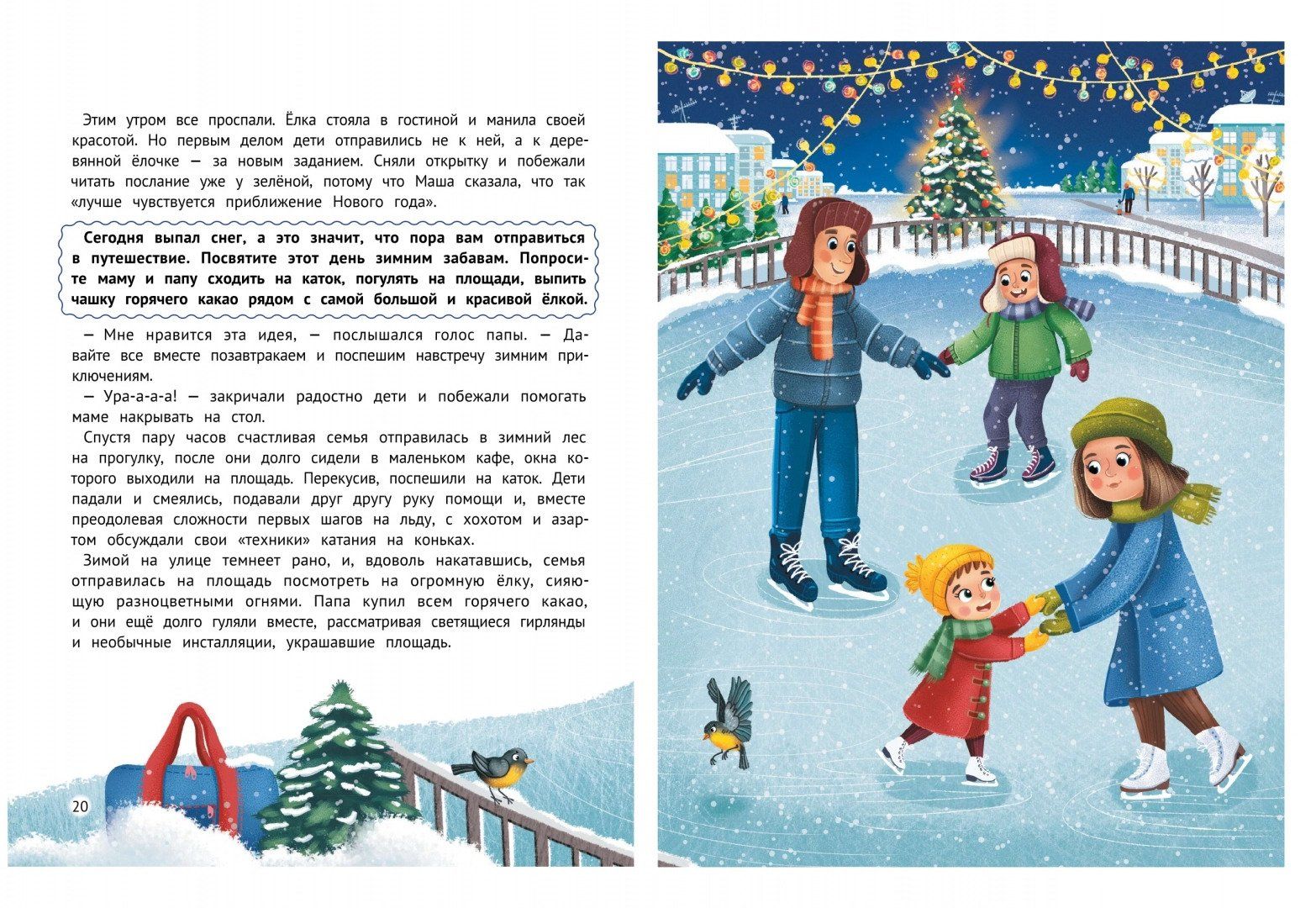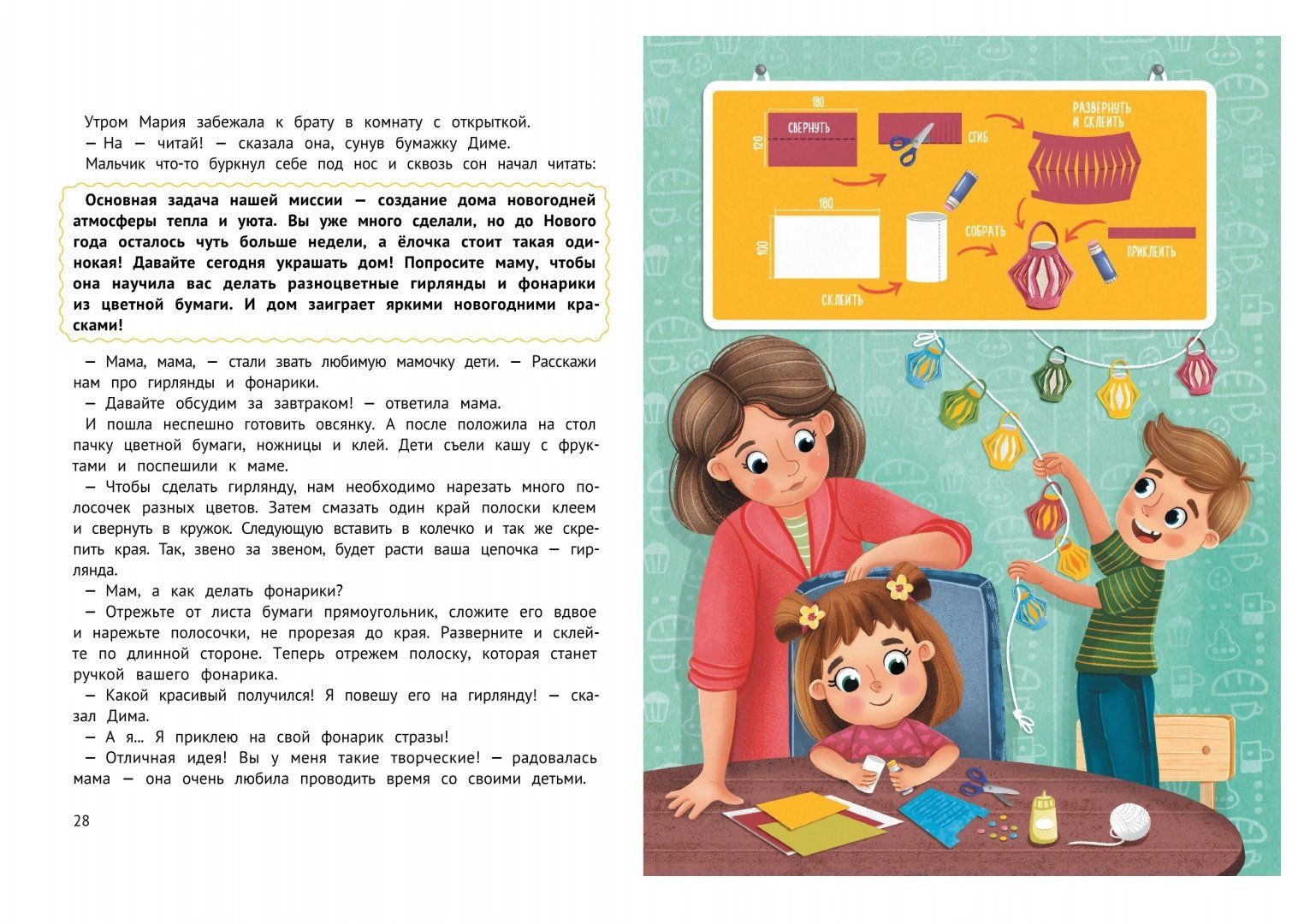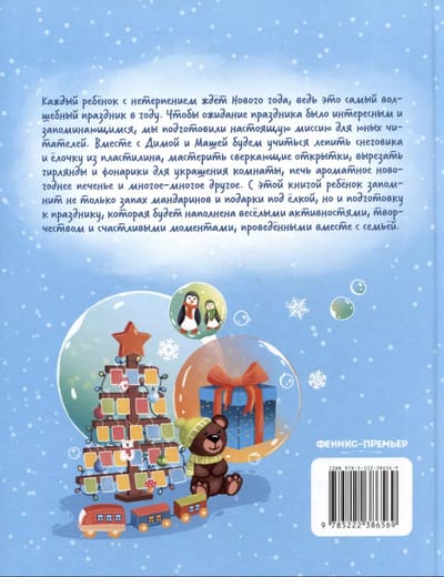 Every child looks forward to the New Year, because it is the most magical holiday of the year. To make the waiting for the holiday interesting and memorable, we have prepared a real mission for young readers. Together with Dima and Masha we will learn to mold a snowman and Christmas tree from plasticine, make sparkling cards, cut out garlands and lanterns to decorate the room, bake fragrant Christmas cookies and much, much more. With this book, the child will remember not only the smell of tangerines and presents under the tree, but also the preparation for the holiday, which will be filled with fun activities, creativity and happy moments spent together with the family.