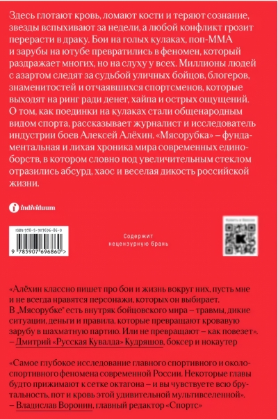 Here they swallow blood, break bones and lose consciousness, stars flash in weeks, and any conflict threatens to escalate into a fight. Naked fist fights, pop-MMA fights and YouTube burrows have turned into a phenomenon that annoys many, but on everyone’s ears. Millions of people with excitement follow the fate of street fighters, bloggers, celebrities and desperate athletes who enter the ring for money, hype and thrills. About how fights on fists became a national sport, says journalist and researcher of the fighting industry Alexey Alekhin. “Meat grinder” is a fundamental and dashing chronicle of the world of modern martial arts, in which, as if under a magnifying glass, the absurdity, chaos and cheerful savagery of Russian life were reflected.