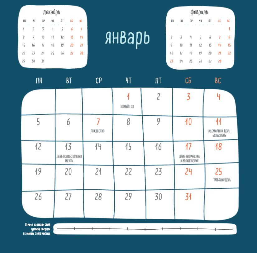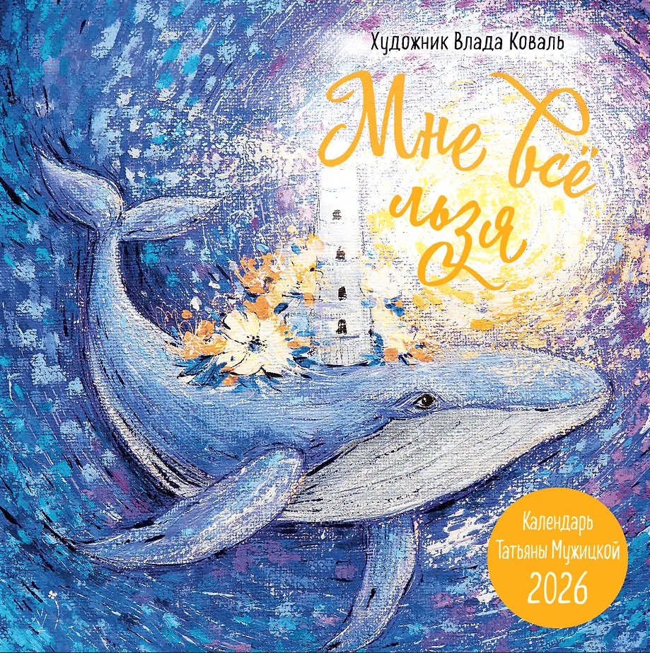 Tatyana Muzhitskaya's calendar with bright illustrations by Vlada Koval. The grid contains inspiring quotes from the author and unusual holidays like "World Thank You Day" and "International Self-Care Day". Each month is a reminder: you can live with joy, ease and love for yourself.