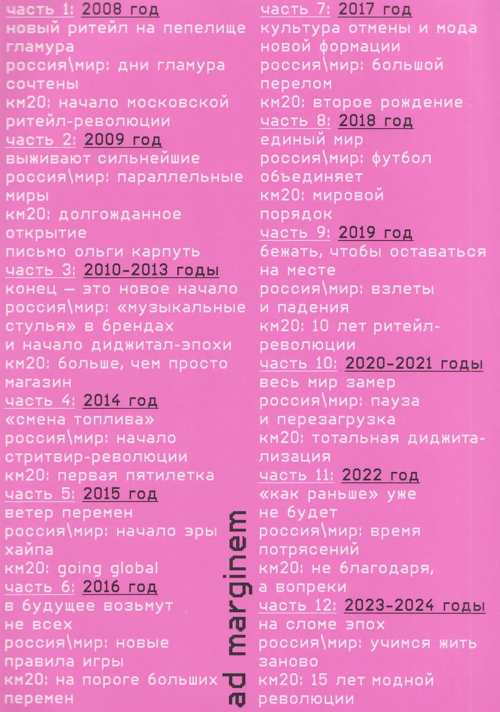 "Fashion 2.0. The History of the Industry Since 2008" is a chronicle of contemporary fashion, told through the lens of one of the most influential spaces in the Russian fashion landscape—the KM20 concept store. From global trends to local cultural shifts, from early collaborations with Vetements and Raf Simons to the digital age and new forms of self-expression, the book traces how the industry has changed and how KM20 has remained at the forefront of these changes. The book's structure connects three narratives—"World," "Russia," and "KM20"—demonstrating how global processes are reflected in the local context and transformed into unique cultural phenomena. Several chapters are also accompanied by personal letters from Olga Karput, in which the founder of KM20 recounts key stages of her professional journey in first-person. This is more than just a document of time—it is a visual and textual panorama of fashion, media, and culture over the past decade and a half, told from the inside by those who shaped its contours.