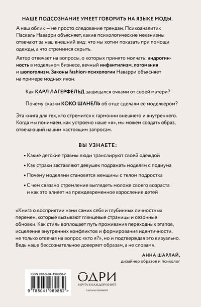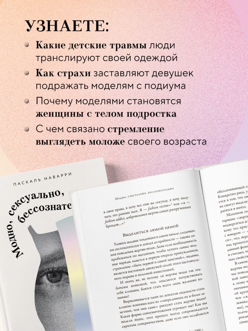 Using psychoanalysis, the author answers questions that are usually kept silent: androgyny in the modeling industry, eternal infantilism, logomania, and shopaholism.