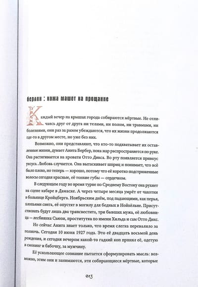 A multitude of characters—both historical and fictional—intersect on the streets of Berlin. Among them are Robert Musil, Otto Dix, Werner Heisenberg, Anita Berber, Vladimir Nabokov, Käthe Kollwitz, Ludwig Mies van der Rohe, Rosa Luxemburg as a butterfly, a sommelier, a murderer, a prostitute, a pickpocket, and several ghosts. We peer into the minds of men, women, and children, observing their movements, the discrepancies between their intentions and actions, their values and their deeds. We see hope, we see deception, and we see death.