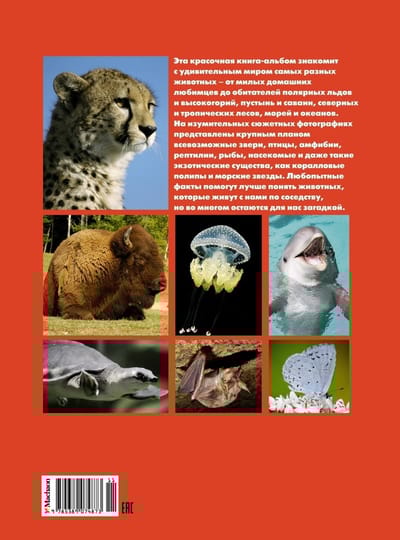 This colorful book-album introduces the amazing world of a variety of animals - from cute pets to inhabitants of polar ice and highlands, deserts and savannas, northern and tropical forests, seas and oceans. The amazing story photographs show close-ups of all kinds of animals, birds, amphibians, reptiles, fish, insects and even such exotic creatures as coral polyps and starfish. Curious facts will help you better understand the animals that live next door to us, but in many ways remain a mystery to us.