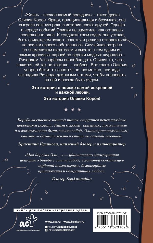 "Life is an endless celebration" is Olivia Coron's motto. Bright, principled and crazy, she played an important role in the history of her friends. However, in a series of events, Olivia did not notice how she was left completely alone. By the age of thirty-three, she was tired of being a witness to other people's happiness and decided to go in search of her own. A chance meeting with a famous writer and at the same time one of the most handsome guys according to fashion magazines - Richard Alvarez is able to give Olivia what she seems to be missing - love. But Olivia is running away from happiness, but perhaps nature has given Richard long legs to keep up with her and always be there for her.