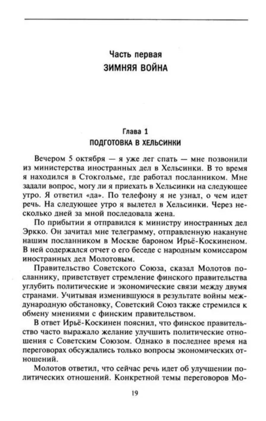 Juho Paasikivi, head of the Finnish delegation at the 1939 Moscow negotiations, described in his book the efforts to prevent war and overcome ingrained mistrust of the USSR. The lawyer and diplomat, elected president of Finland in 1946, recounted confidential conversations and meetings with the Soviet leadership shortly before the signing of the peace treaty ending the Winter War, demonstrating how dramatic and captivating politics can be.