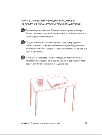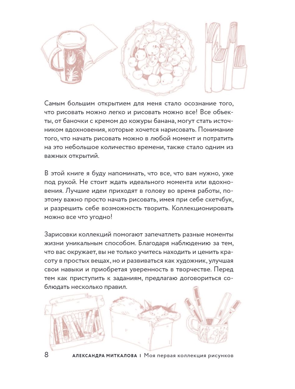 On its pages, the artist and illustrator Sasha Mitkalova will tell you how to painlessly overcome one of the most common problems - the fear of a blank slate. Together with it, you will select the necessary artistic materials, analyze the basic rules of drawing and begin to collect your first collection of drawings. And the tasks and exercises created by Sasha will add interactivity to the learning process and inspire everyone to new drawings.