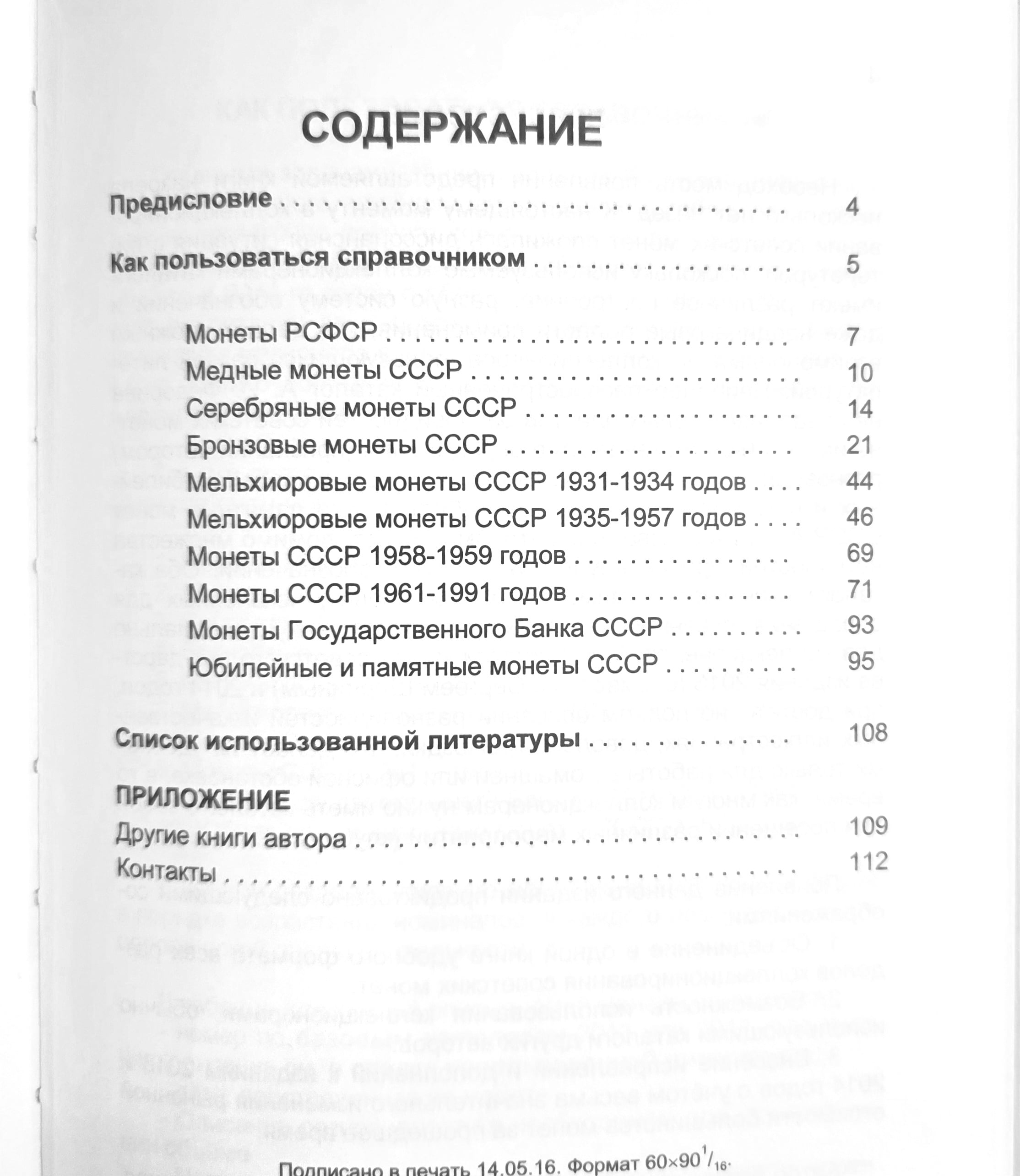 This publication is a practical guide for collecting Soviet coins and is a presentation of the catalogues of coins of the Soviet state by Yaroslav Adrianov and Sergey Shirnin, published in 2013 and 2014, with all additions and changes as of May 2016, adapted from the catalogues of A.I. Fedorin (edition VI 2015) for standard coins and A.I. Shirokov (with co-authors) for jubilee and commemorative coins (edition 2012).