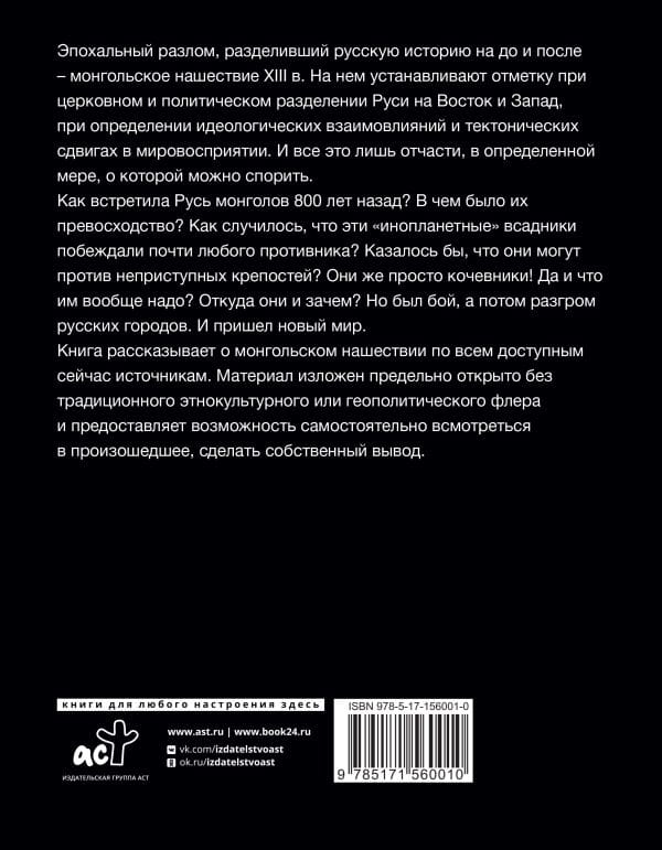 How did Russia meet the Mongols 800 years ago? What was their superiority? How did it happen that these "alien" horsemen defeated almost any opponent? It would seem that what could they do against impregnable fortresses? They're just nomads! And what do they want? Where did they come from and why? But there was a battle, and then the defeat of Russian cities. And a new world came. The book tells about the Mongol invasion on all sources available now. The material is laid out extremely openly without the traditional ethno-cultural or geopolitical flavor and provides an opportunity to look at what happened and make your own conclusion.