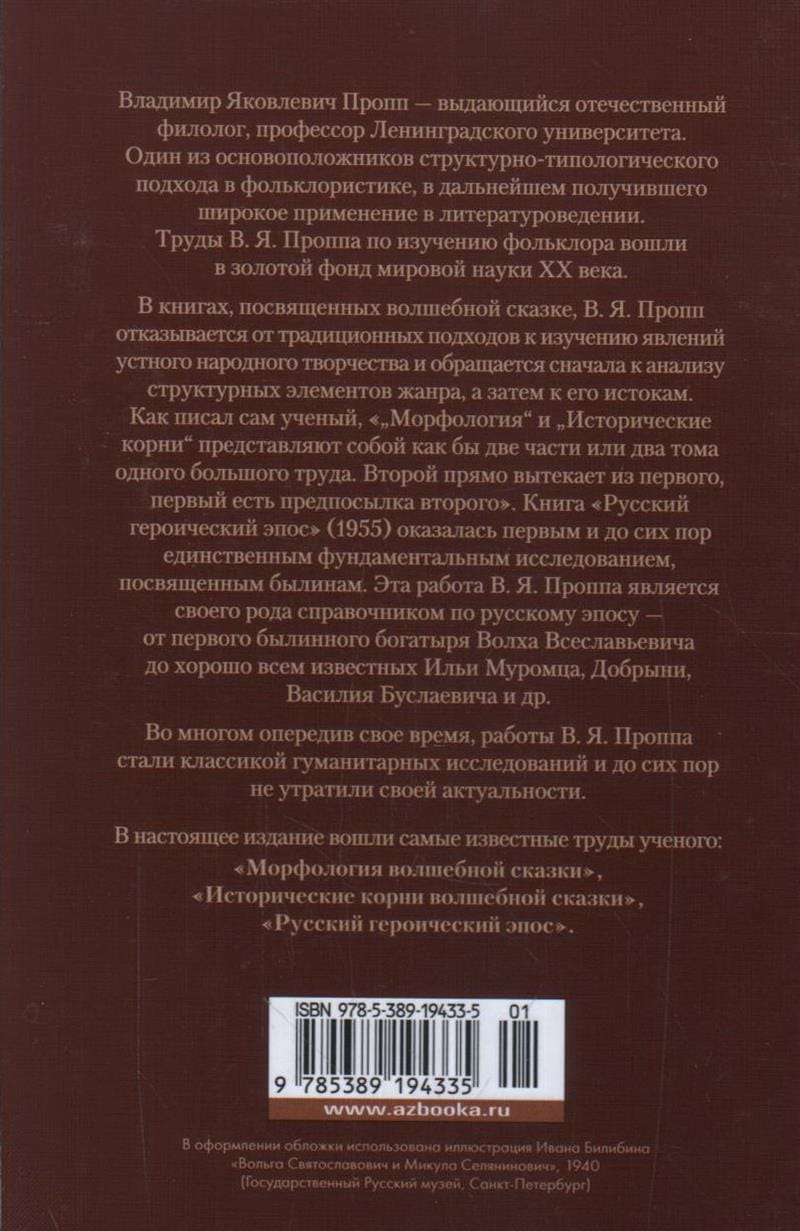 Vladimir Yakovlevich Propp was an outstanding Russian philologist, professor at Leningrad University. He was one of the founders of the structural-typological approach in folklore studies, which later became widely used in literary studies. V.Y. Propp's works on the study of folklore entered the golden fund of world science of the twentieth century. In books devoted to the magic fairy tale, V. Y. Propp refuses traditional approaches to the study of oral folklore and turns first to the analysis of structural elements of the genre, and then to its origins, establishing a typological similarity between the magic fairy tale and initiation rites. As the scholar himself wrote, "Morphology" and "Historical Roots" represent, as it were, two parts or two volumes of one large work. The second directly follows from the first, the first is a prerequisite of the second. I am as strictly methodical and consistent as possible moving from the scientific description of phenomena and facts to the explanation of their historical causes". The book "Russian Heroic Epic" (1955) was the first and still the only fundamental study devoted to bylinas. V.Y. Propp undertook their plot, thematic and poetic analysis. This work of the scientist is a kind of a reference book on the Russian epic - from the first Bylin bogatyr Volkh Vseslavievich to the well-known Ilya Muromets, Dobrynya, Vasily Buslaevich and others. In many ways ahead of his time, V. Y. Propp's works have become classics of humanitarian research and have not lost their relevance to this day.