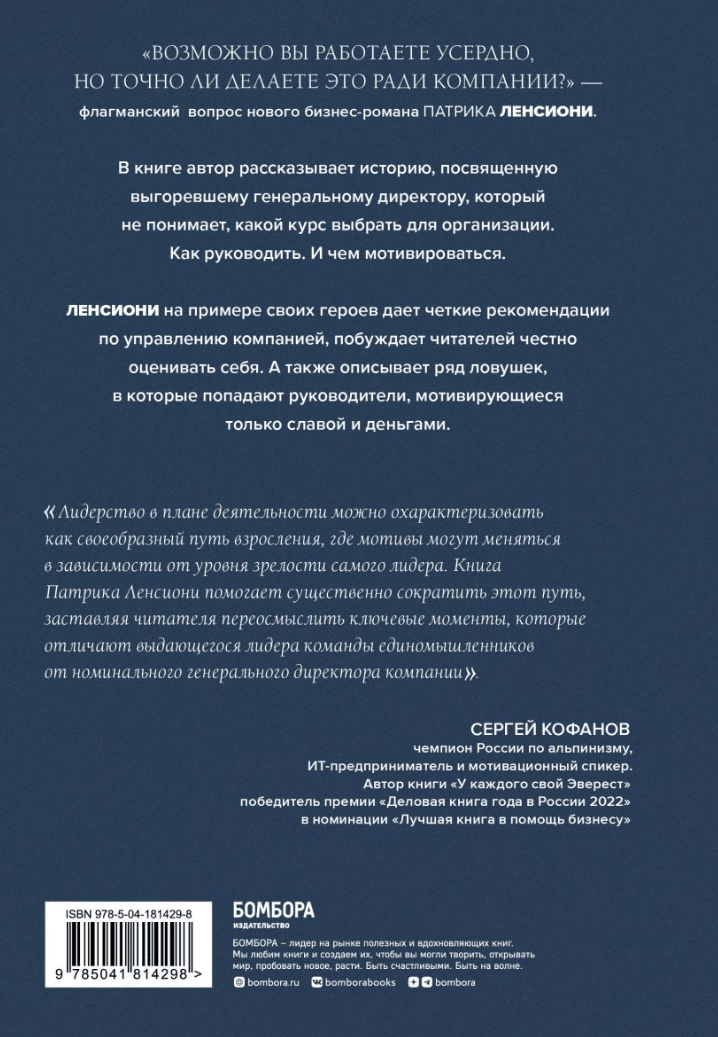 Lencioni, using the example of his heroes, gives clear recommendations for managing the company, encourages readers to honestly evaluate themselves. It also describes a series of traps that executives fall into, motivated only by fame and money.