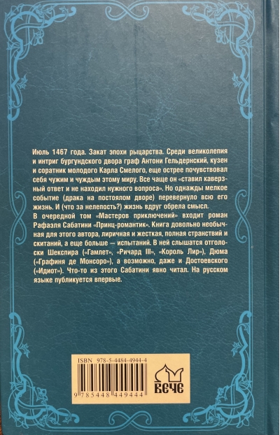 The next volume of "Masters of Adventure" includes Rafael Sabatini's novel "The Romantic Prince." The book is quite unusual for this author, lyrical and harsh, full of wanderings and wanderings, and even more - trials. It echoes Shakespeare ("Hamlet," "Richard III," "King Lear"), Dumas ("The Countess de Monsoreau"), and perhaps even Dostoevsky ("The Idiot"). Sabatini clearly read some of this. Published in Russian for the first time.