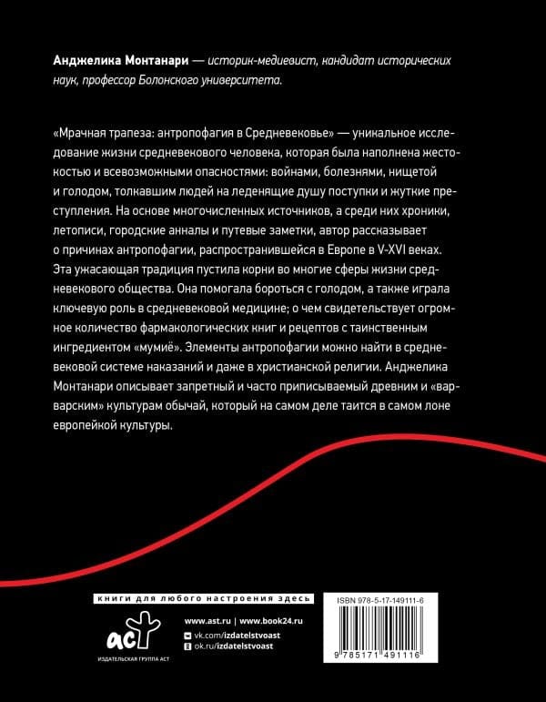 A unique study of medieval human life, which was filled with cruelty and all sorts of dangers: wars, disease, poverty and hunger, pushing people to chilling acts and gruesome crimes. Based on numerous sources, including chronicles, annals, city annals and travel notes, the author tells about the reasons for the anthropophagy that spread in Europe in the V-XVI centuries. This horrifying tradition took root in many spheres of life in medieval society. It helped to fight hunger and also played a key role in medieval medicine; as evidenced by the vast number of pharmacological books and recipes with the mysterious ingredient "mumiyo". Elements of anthropophagy can be found in the medieval punishment system and even in the Christian religion. Angelica Montanari describes a forbidden and often attributed to ancient and "barbaric" cultures, a custom that in fact lurks in the very bosom of European culture.