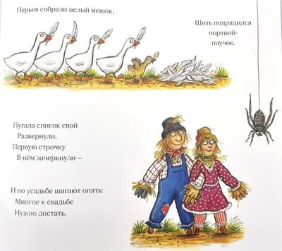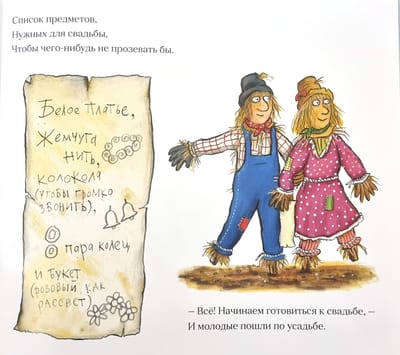 Marry me! "Yes! Hurray!" Betty replied, and they set about preparing. The spider tailor sewed a magnificent dress from white goose feathers. The cows lent their bells to ring merrily at the wedding. The crab strung beads from colorful shells. The nimble mice searched the yard and got rings from old curtains. All that was left was to pick a bouquet, and Billy went to get it. But one day passed, then another, and there was still no Billy. Meanwhile, the farmer put a new scarecrow in the field - a smartly dressed Harry.