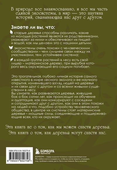 In this remarkable and inspiring narrative, the author tells us how trees that have lived side by side for hundreds of years evolve, how they learn and adapt, how they compete with their neighbors and cooperate with each other, how they are like humans in this, and how, like the structure of human society, at the center of their society are the Mother Trees, powerful forces that connect and support all those around them.