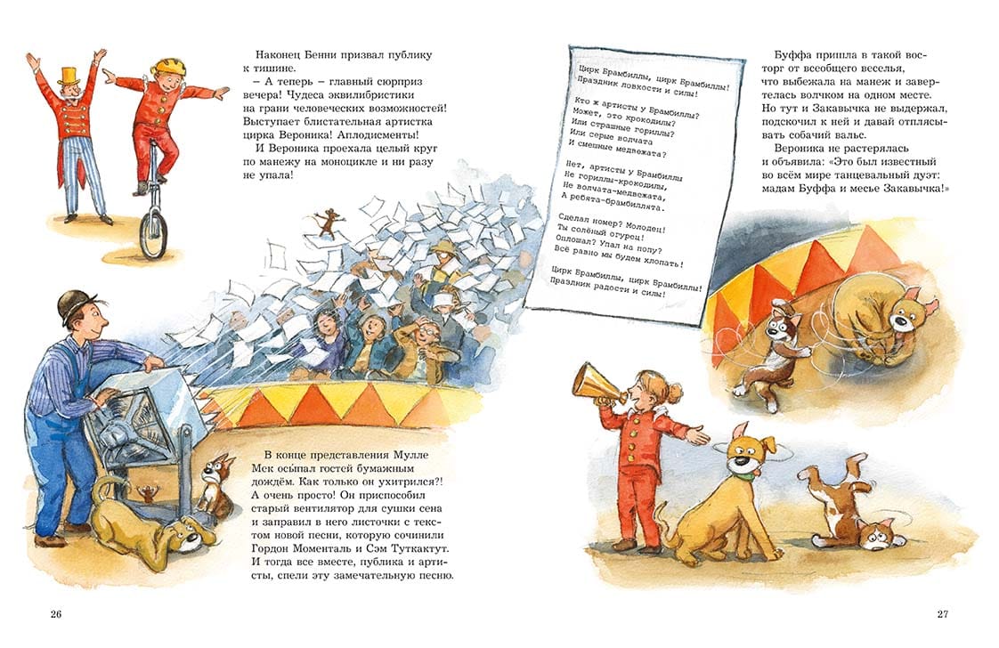 One day, a sullen stranger arrives in the small town where Mulle Mek, his friends and neighbors live. It turns out to be none other than Benny Brambilla, the director of a world-famous circus. Since some time, his strength has waned and he has fallen into a black despondency. Instead of putting on fun, noisy shows, Benny Brambilla now quietly weaves baskets and sells them at the market. "At least they do some good," he says. The villagers are convinced that the sad old man can be helped. They just need to restore his faith in himself and his art. This idea so inspired all the townspeople that no one wanted to stay aside. Everyone rushed to do their part. Mulle Meck and his friends helped Benny Brambilla to revitalize his spirit and even set up his own circus school. At the same time, Mulle converted Benny's old car into an environmentally friendly electric car and built a trailer van to it so that the maestro could travel around the world and bring joy to people. The creators of the books about Mull Meck are the famous Swedish writer Georg Johansson, author of many children's books about science and technology, and no less famous illustrator Jens Album. The stories about the jack-of-all-trades, mechanic Mulla Mecca and his dog Buffet have been hugely popular with Swedish children for over 25 years. They love Mullet as much as the famous characters in Astrid Lindgren's fairy tales.