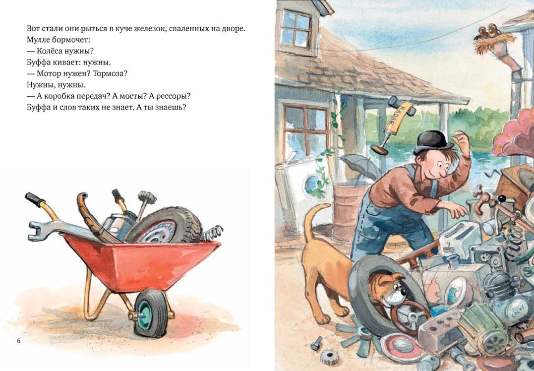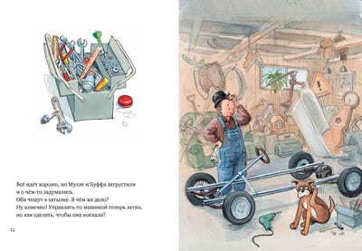 Mechanic Mulle Meck lives in a cozy house on the edge of the forest with his faithful dog, Buffa. Mulle is a jack of all trades! From a pile of rusty scrap metal, he can build anything, even a complete car—complete with wheels, gearbox, dashboard, engine, and everything else a car needs. Such a car can travel for miles and then head off to places far, far away! Mulle can also easily build a boat, a house, and even an airplane—but you'll find more about that in future books in the "Mulle Meck: Handyman" series. This series will appeal to the youngest readers who are just beginning their exploration of technology, are keenly interested in the workings of various mechanisms, and are eager to know how things work. The stories of Master Mullah Mekka and his dog Buffa have been incredibly popular with Swedish children for two decades now, and Mullah himself is loved no less than the famous heroes of Astrid Lindgren's fairy tales – for his resourcefulness, ingenuity, and unfailing optimism.