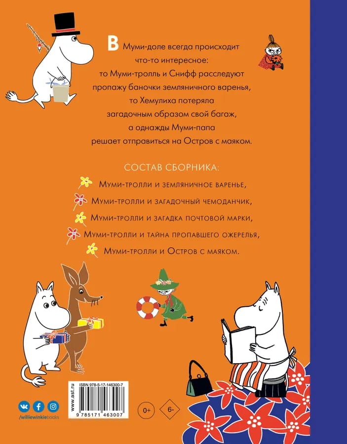Something interesting always happens in Moomi-Dole: then Moomi-Troll and Sniff, like Sherlock Holmes and Dr. Watson, investigate the disappearance of a jar of strawberry jam, then Hemuliha mysteriously lost her luggage, and one day Moomi-Papa together with all his family decides to go to the Island with a lighthouse. "Moomi-Trolls and Adventures in Moomi-Dole" - a fun collection, which includes 5 stories: "Moomi-Trolls and strawberry jam", "Moomi-Trolls and the mysterious suitcase", "Moomi-Trolls and the mystery of the postage stamp", "Moomi-Trolls and the mystery of the missing necklace", "Moomi-Trolls and the Island with a lighthouse".